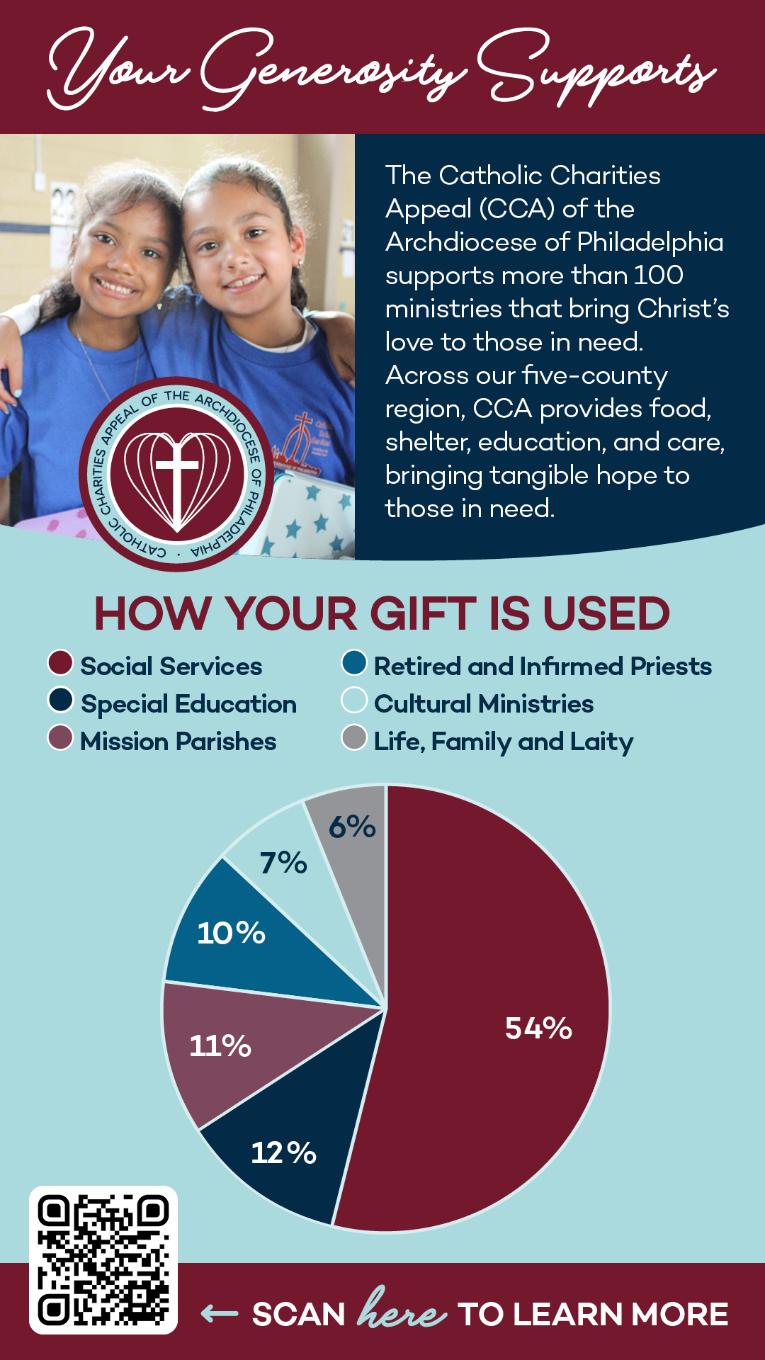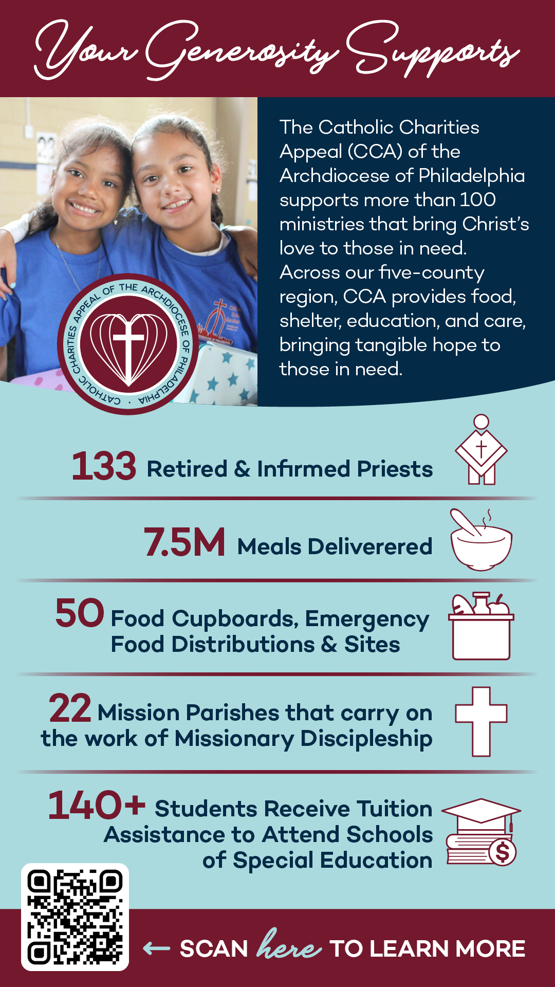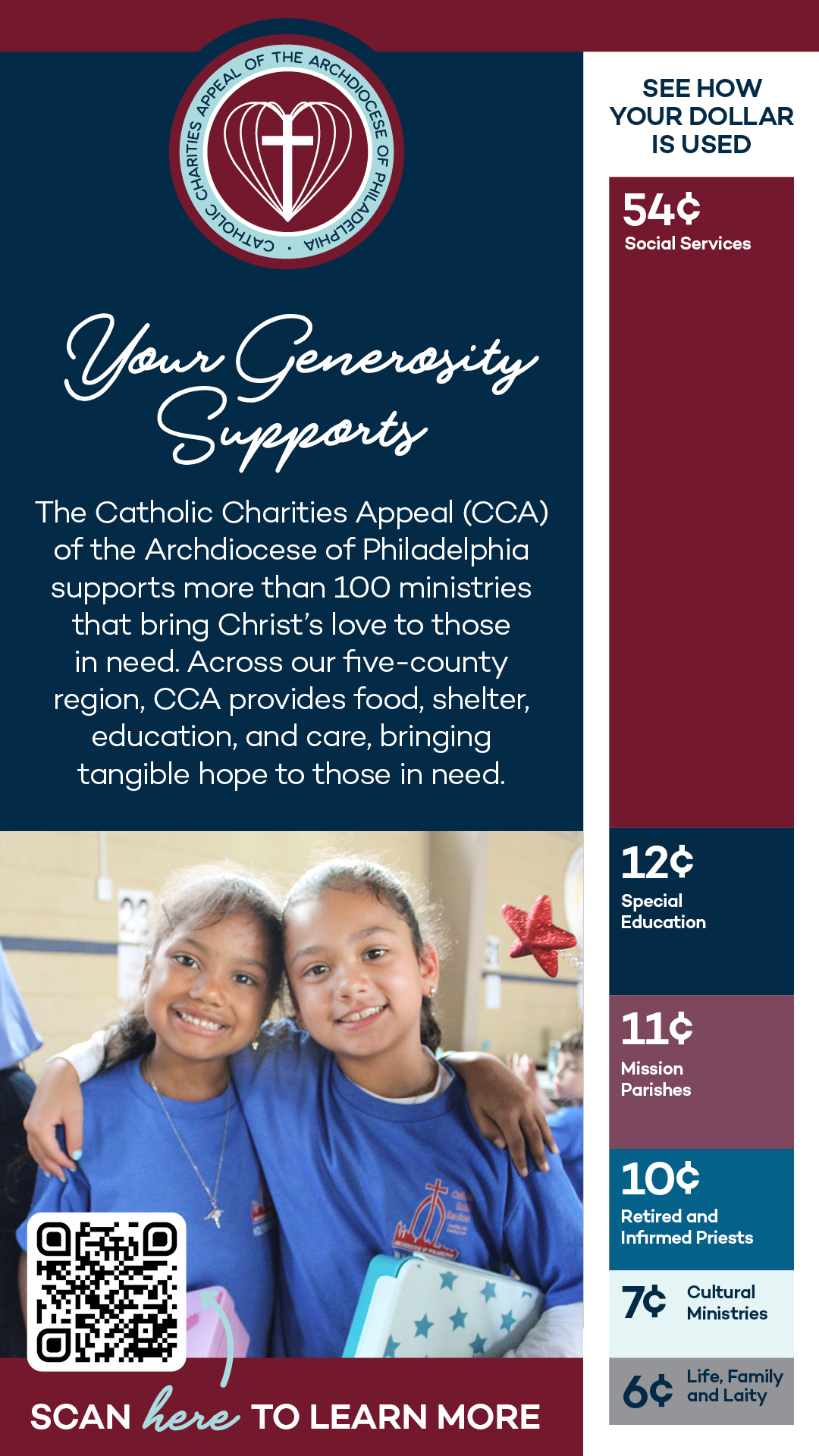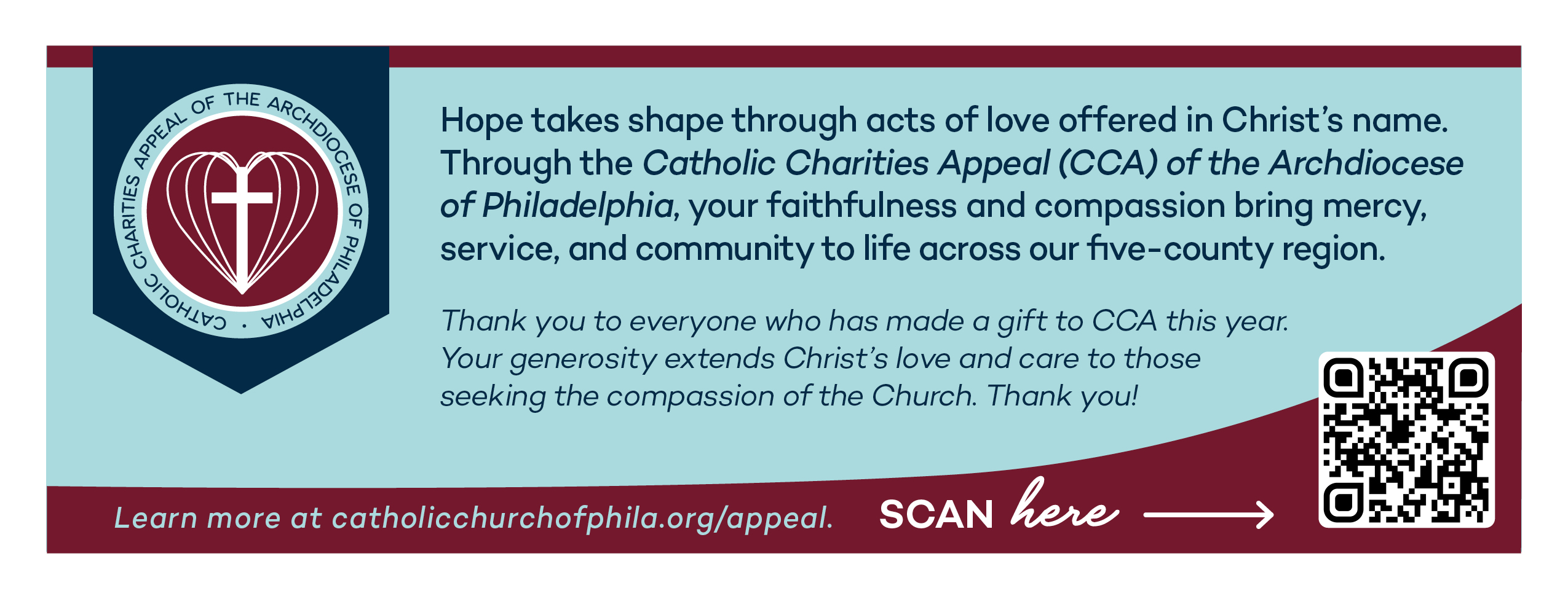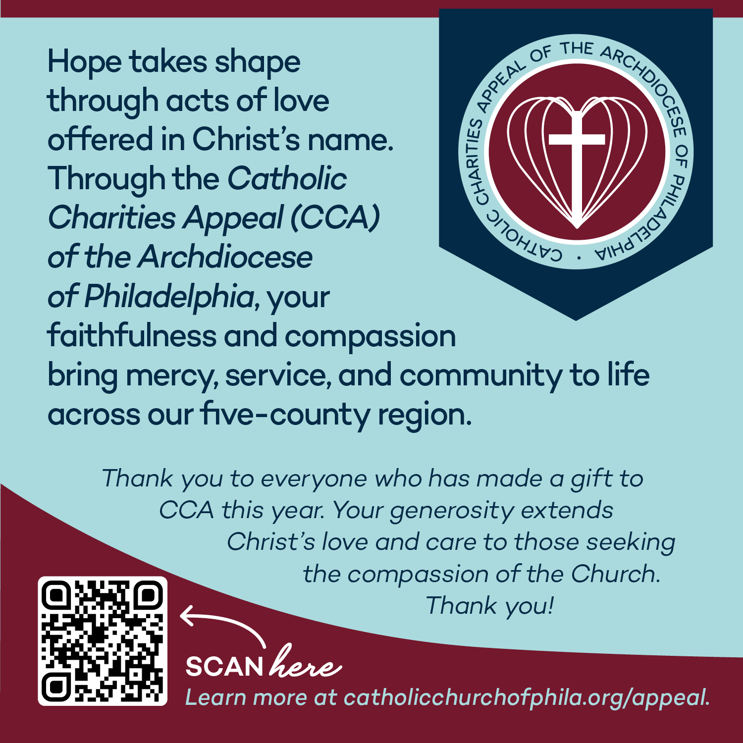 Your support of the Catholic Charities Appeal (CCA) of the Archdiocese of Philadelphia strengthens our local Church, our communities, and our shared mission of faith and service. It sustains the ministries, programs, and services that bring hope to the one in five individuals in our five-county region who seek the compassion of the church. Join us today!