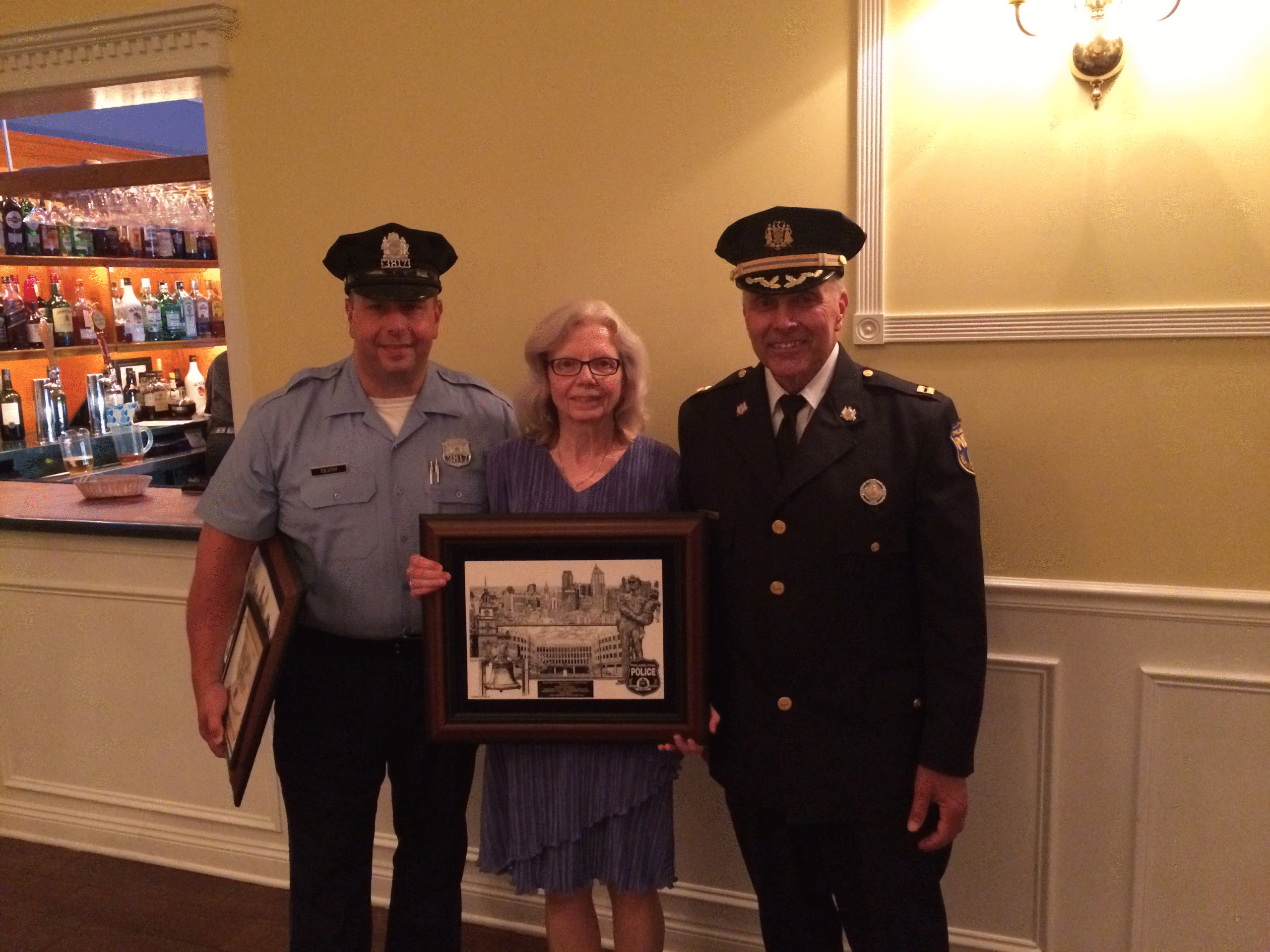 Pictured left to right: Officer Thomas Tolstoy; Bonney Dahlgren DosSantos, director of the St. Monica Eldercare Program; Captain Lou Campione of the Philadelphia Police Department’s 1st District.