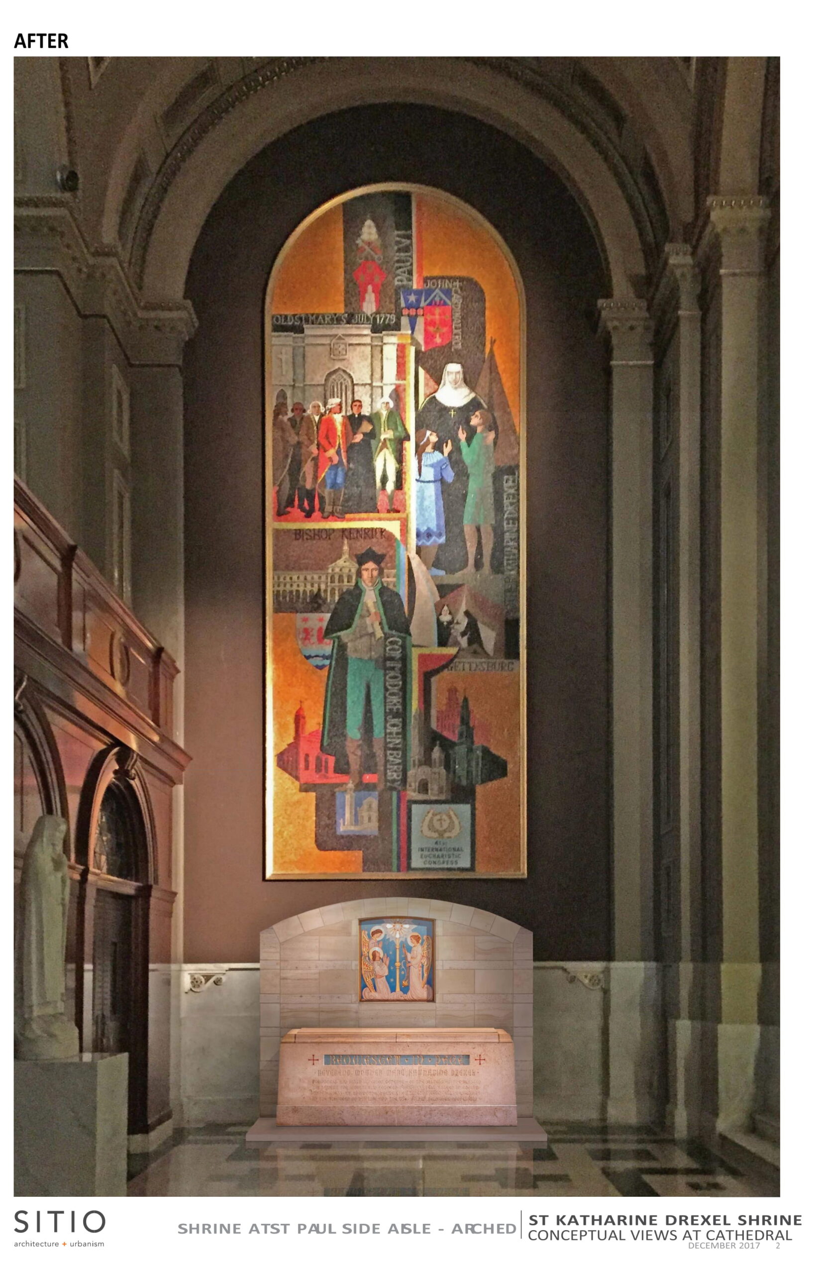 In May 2016 the Sisters of the Blessed Sacrament announced their decision to sell the Motherhouse property where the current shrine is housed, along with other property in Virginia. At that time the Sisters asked the Archdiocese to consider creating a sacred space for Saint Katharine’s remains. Earlier this year, the Archdiocese agreed to create a new space for her tomb at the Cathedral Basilica. This new tomb will be immediately adjacent to the Drexel altar donated by the Drexel family decades ago.